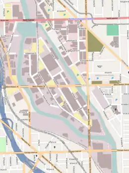 Goose Island is crossed by Division Street, running east–west, and Halsted Street, which runs north–south across the southeast portion of the island.[8] In 1866 Halsted Street was connected to the island with the construction of a bridge across the river;[9] a bridge across the canal at Halsted Street was added in 1874. The current bridges at these crossing points were constructed in 1955 and 2012 respectively.[10] Division Street was first connected to the island with the construction of a bridge across the river in 1869; a second bridge across the canal was added in 1870.[11] These bridges were replaced with Bascule bridges in 1904 and 1903 respectively.[12] The East Division Street bridge was the second ever Chicago-type Bascule bridge. In 2014 the East bridge was determined to have deteriorated such as to require complete replacement. It was removed and has been replaced with a temporary Bailey bridge.[13]