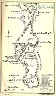 The Gwalior city and the fort is connected to other Indian cities by major highways NH 44 and 46 (Asian Highway 43 and 47), a railway station and airport (IATA: GWL). It is located near other historic Hindu and Jain temples from the medieval era.[9][10][11]