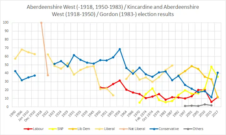 The Scottish Conservatives took the most votes in the area at the 2017 local council elections, prompting party leader Ruth Davidson to say on a visit to Inverurie that "We won the local government election in Gordon this week, beating the SNP into second place. It means that in this seat, as in many others, it is a two-horse race between us and the [Scottish] Nationalists."[6] In response to Davidson's comments, the SNP MP for Gordon at the time, Alex Salmond said: “It’s just arrogance, for Ruth Davidson to continue the line of ‘we’re going to take this seat, and we’re going to take that seat’. Once it doesn't happen, it's very bad news for Ruth Davidson's credibility.”[7]
