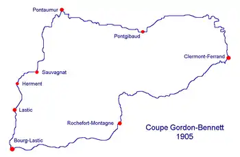 In 1905, The Times reported on the last of the six Gordon-Bennett Cup Races, which took place in France on July 5 over a 137 km mountainous circuit in the Auvergne near to Clermont-Ferrand. After four circuits of the course, a total of 548 km, which he completed in 7hr 2min 42sec, an average speed of 77.78 km/h, the Frenchman Léon Théry on a 96 hp Richard-Brasier won for the second year in a row. Lancia on a FIAT for Italy was fastest over the first two laps, but broke down with radiator problems during his third lap. Théry eventually came in first ahead of Nazzaro, also on a FIAT, who finished in 7hr 19min 9sec.[23]