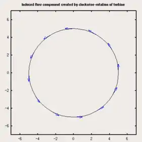 As the turbine rotates, in this case in a clockwise direction, the motion of the foil through the fluid changes the apparent velocity and angle of attack (speed and direction) of the fluid with respect to the frame of reference of the foil. The combined effect of these two flow components (i.e. the vector sum), yields the net total "Apparent flow velocity" as shown in the next figure.