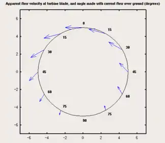 [With regards to the figure "Apparent flow velocity...", Lucid Energy Technologies, rights holder to the patent to the Gorlov Helical Turbine, notes that this diagram, with no apparent velocity at an azimuth angle of 180 degrees (blade at its point in rotation where it is instantaneously moving in downstream direction), may be subject to misinterpretation. This is because a zero apparently flow velocity could occur only at a tip speed ratio of unity (i.e. TSR=1, where the current flow induced by rotation equals the current flow). The GHT generally operates at a TSR substantially greater than unity.]