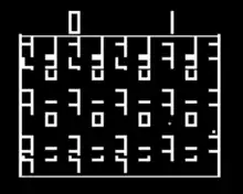 Gotcha is a two-player maze game in which one player attempts to catch the other. The maze is composed of a repeating pattern of elements set in multiple columns on the screen. The "Pursuer" is represented by a square, while the "Pursued" is identified by a plus sign. As the Pursuer gets closer to the Pursued, an electronic beeping sound plays at an increasing rate until the Pursuer reaches the Pursued. Whenever the Pursued is caught, the Pursuer scores a point, the maze disappears for a brief moment, and the Pursuer is moved to a random position on the right side of the screen. There is no score for the Pursued, so determining who won is left to the players. The maze itself is continually changing, with two invisible lines half a screen apart scanning down the maze and overwriting maze elements. Above the maze is the Pursuer's score and the time elapsed in the game. Each game is for a set period of time. When time runs out, the game enters attract mode, where the score resets and the square and plus sign begin bouncing around the maze in a diagonal pattern as the maze continues to change.[2] Each game costs a quarter. The time per round is adjustable per machine over a range from 30 seconds to 2 minutes.[3]