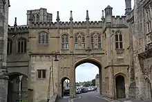 The colleges of Oxford and Cambridge universities in England comprise an outstanding example of English Gothic architecture. The source of inspiration for these English colleges is not the architecture of monasteries, but rather 14th and 15th century manor houses.[2] The structure of the colleges originally developed haphazardly but New College, Oxford, founded in 1379, from the beginning received a planned structure centred on a quadrangle and a cloister. The architectural ensemble incorporated a hall, a chapel, a library and accommodation, and was designed by William Wynford. The concept was further developed at Queens' College, Cambridge in the 1440s, probably designed by Reginald Ely.[2] An example of a college inspired by monastic architecture can be found in Paris, in the College des Bernardins[18] Formerly part of Paris University, this building, ordered in 1245 by the abbot Stephen of Lexington, draws upon Cistercian architecture.