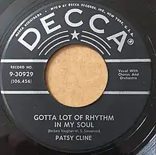 Patsy Cline had her only significant hit during the 1950s with "Walkin' After Midnight" (1957). The song's follow-up singles were a mixture of traditional country, pop and rockabilly music.[2] "Gotta Lot of Rhythm in My Soul" was an example of one of Cline's Rockabilly recordings recorded after the 1957 hit. The song was written by Barbara Vaughan and W.S. Stevenson.[1] The latter writer was a pseudonym for Four Star music executive, Bill McCall, who oversaw Cline's recordings and the royalties she received while recording for his company.[3] The track was recorded on January 9, 1959 at the Decca Records studio in Nashville, Tennessee. The session was produced by Owen Bradley. It was among the first of Cline's sessions to include the background vocal group, The Jordanaires. Four additional songs were cut during the same January sessions.[4]