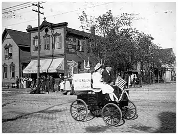 Schloemer then made the first practical working gasoline automobile with his configuration of parts and assemblies in 1889.[13][14][15] He first constructed a uniquely designed buggy with the help of Frank Toepfer, a machinist and half owner of the Toepfer machine shop in Milwaukee.[7] In this buggy, he installed the gasoline engine from Sintz Gas Engine Company of Grand Rapids. He then contrived for his motorized carriage a triggering system to ignite the gasoline because there were no spark plugs available at the time. He came up with a homemade sparking mechanism consisting of two points of hardened steel striking one another causing a spark to ignite the gasoline fumes in the engine cylinder to produce the energy needed by the internal combustion explosion.[16] The fragile points had to be replaced after only a few miles of driving.[17] Schloemer drove his motorized carriage buggy on the avenues of Milwaukee in 1890 at speeds up to 12 miles an hour.[4][6][11] The automobile was run at 18 miles an hour later with naphtha as fuel.[18]