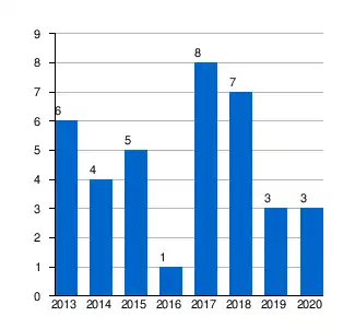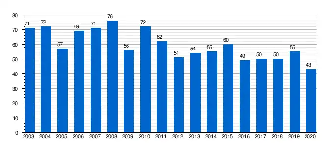 The Delegation of the Government manages the national registers of gender violence victims; the women register was created in 2003[3][4] and the childs register in 2013.[5] Since its creation, it has recorded more than 1,030 women and 34 minors murdered in this kind of violence.[6]