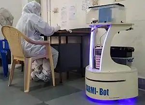 The robot named ‘KARMI-Bot’ is used to assist patients at the medical college's COVID-19 isolation ward.The robot developed by ASIMOV Robotics, was donated to medical college by famous actor Mohanlal. The robot has fully autonomous features for dispensing food & water, disinfection, collecting trash and other features like video call. [5]