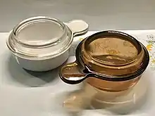 Grab-Its are microwave-safe cookware easily identifiable by their tab handle. They were introduced by Corning Glass Works in 1977, under the Corning Ware brand and are now sold in a slightly different form by Corelle Brands. Grab-Its are notable as being among the first cookware specifically designed for microwave use - their design was recognized by the Smithsonian's Cooper-Hewitt, National Design Museum. Grab-Its strongly resemble porringers.