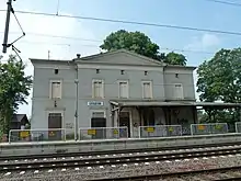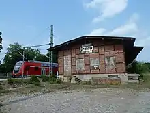 The station building is located southwest of the tracks. It is a Neoclassical, two-storey building with five portals on its long side and three portals in the transverse direction with a gable roof and a mezzanine (that is a low storey). In both directions, the building had an avant-corps with a triangular gable, so that it has an approximately cross-shaped floor plan.[12] It has not been used for railway purposes since the early 1990s. Until shortly after 2000 there was a restaurant in the building, but since then it has been empty. Its architect is not known by name, but it is believed, due to its similarities to many other buildings on the Berlin–Hamburg line, that the director of the Berlin-Hamburg Railway, Friedrich Neuhaus, delivered at least guidelines for the design of the station. A virtually identical station building was built at Bergedorf station in Hamburg; this was demolished in 1937 during the reconstruction of the local railway facilities.[12]