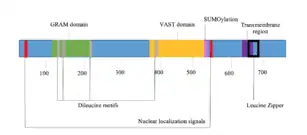 The mature protein contains two nuclear localization signals, pat4 and pat7.[16] There are four dileucine motifs, three located within or close to the GRAM domain.[16] A leucine zipper pattern extends through a majority the transmembrane region.[16] A SUMOylation site is located directly after the VASt domain.[17] The proteins secondary structure consists of alpha-helices, beta-strands and coils.[18] Beta-strands are mainly located within the two domains, while the alpha-helixes are concentrated near the transmembrane region. Three disulfide bonds are predicted throughout the protein.[19]