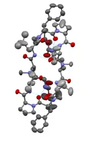 It is a derivative of gramicidin, produced by the gram-positive bacterium Bacillus brevis. Gramicidin S is a cyclodecapeptide, constructed as two identical pentapeptides joined head to tail, formally written as cyclo(-Val-Orn-Leu-D-Phe-Pro-)2. That is to say, it forms a ring structure composed of five different amino acids, each one used twice within the structure.[2] Another interesting point is that it utilizes two amino acids uncommon in peptides: ornithine as well as the atypical stereoisomer of phenylalanine. It is synthesized by gramicidin S synthetase.[3]