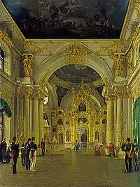 The Grand Church of the Winter Palace (Russian: Собор Спаса Нерукотворного Образа в Зимнем дворце) in Saint Petersburg, sometimes referred to as the Winter Palace's cathedral, was consecrated in 1763. It is located on the piano nobile in the eastern wing of the Winter Palace, and is the larger, and principal, of two churches within the Palace. A smaller, more private church was constructed in 1768, near the private apartment in the northwest part of the wing. The Grand Church was designed by Francesco Rastrelli, and has been described as "one of the most splendid rooms" in the Palace.[1] Today, the church is an unconsecrated exhibition hall of the State Hermitage Museum.[1]
