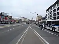 The Grand Concourse's southern terminus is at 138th Street. Shortly afterward, it merges with the entrance ramp to southbound Major Deegan Expressway (I-87), as well as the exit ramp from northbound I-87. The Grand Concourse continues as a divided eight-lane avenue, with two to three traffic lanes in each direction, until 161st Street.[1] North of there, the service roads in each direction begin, and a unidirectional buffered bike lane runs on the left edge of either service road.[4] The Grand Concourse is briefly a ten-lane boulevard with four roadways, two in each direction, until just south of 165th Street. There, the northbound and southbound inner roadways merge into a five-lane undivided roadway with two lanes in each direction and a left-turn lane and painted median in the center.[1] The buffered bike lanes on each service road end at 171st Street, and conventional bike lanes start on the right lane of the respective service roads.[4] This configuration with three roadways (two service roads and one main road) continues north until Mosholu Parkway, where the Grand Concourse ends. At Fordham Road, the main road passes underneath in a grade-separated junction, while the service roads intersect with Fordham Road.[1]