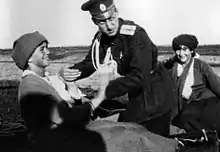 During the war, Maria and Anastasia also paid a visit to a nurses' school and helped to tend to the children. She wrote her father that she thought of him when she was feeding the children and cleaned the gruel running down their chins with a spoon.[21] For a break during the war, Maria, her sisters and mother sometimes visited the Tsar and Tsarevich Alexei at the war headquarters in Mogilev. During these visits, Maria developed an attraction to Nikolai Dmitrievich Demenkov, an officer of the day at the Tsar's Headquarters. When the women returned to Tsarskoye Selo, Maria often asked her father to give her regards to Demenkov and sometimes jokingly signed her letters to the Tsar "Mrs. Demenkov".[22]