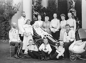 The grand duke was a lifelong bachelor, never involved in scandals. His cousin Grand Duke Alexander Mikhailovich accused him of misogyny in his book of memoirs, but this was contradicted with the close affective relationships he had with female members of his family. He was adored by his family and especially by his young nieces and nephews, with whom he would happily play and ride for hours.[7] He was particularly close to the children of his brother Konstantin. His nephew Prince Gabriel Konstantinovich remembered him, as a "wonderful, kind person" who was almost a second father and wherever they saw him, they ran across the room, jumping up to hug him and wrap their arms around his neck. Dmitry Konstantinovich also loved to tease the children and play practical jokes on them.
