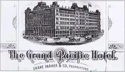 The Grand Pacific Hotel was one of the first two prominent hotels built in Chicago, Illinois, after the Great Chicago Fire.[1] The hotel, designed by William W. Boyington and managed for more than 20 years by John Drake, was located on the block bounded by Clark Street, LaSalle, Quincy and Jackson.[2] It was a replacement for the Paficic Hotel, which had been built in 1871 (also designed by Boyington), only to burn in the fire later that year.[3]