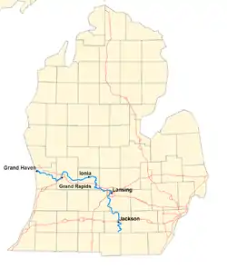 The headwaters of the Grand River begin from natural springs in Somerset Township in Hillsdale County near the boundary with Liberty Township in Jackson County.[6] From there, the river flows through Jackson, Ingham, Eaton, Clinton, Ionia, Kent, and Ottawa counties before emptying into Lake Michigan. The river runs through the cities of Jackson, Eaton Rapids, Lansing, Grand Ledge, Portland, Ionia, Lowell, Grand Rapids, and Grand Haven.