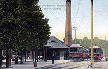 One of the most significant stations was Preston Junction, which sat near the middle of the line and which was located at the junction with the Hespeler branch that ran along the east side of the Speed River. Preston Junction had been an operations centre since the construction of the Preston and Berlin Street Railway in 1904, hosting the steam boilers that powered its electrification system, as well as its car barns, while also functioning as a passenger transfer point between it and the Galt, Preston and Hespeler Street Railway. The passenger station was constructed in 1905.[48] Under the consolidated Grand River Railway, Preston Junction continued to be an important station until the end of service.[7]
