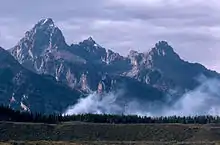 In addition to 13,775-foot-high (4,199 m) Grand Teton, another nine peaks are over 12,000 ft (3,700 m) above sea level.[65] Eight of these peaks between Avalanche and Cascade Canyons make up the often-photographed Cathedral Group.[66] The most prominent peak north of Cascade Canyon is the monolithic Mount Moran (12,605 ft (3,842 m)) which rises 5,728 ft (1,746 m) above Jackson Lake.[67] To the north of Mount Moran, the range eventually merges into the high altitude Yellowstone Plateau. South of the central Cathedral Group the Teton Range tapers off near Teton Pass and blends into the Snake River Range.[68]