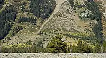 The role of wildfire is an important one for plant and animal species diversity.[121] Many tree species have evolved to mainly germinate after a wildfire. Regions of the park that have experienced wildfire in historical times have greater species diversity after reestablishment than those regions that have not been influenced by fire.[121][122] Though the Yellowstone fires of 1988 had minimal impact on Grand Teton National Park, studies conducted before and reaffirmed after that event concluded that the suppression of natural wildfires during the middle part of the 20th century decreased plant species diversity and natural regeneration of plant communities. One study conducted 15 years before the 1988 Yellowstone National Park fires concluded that human suppression of wildfire had adversely impacted Aspen tree groves and other forest types.[123] The majority of conifer species in Grand Teton National Park are heavily dependent on wildfire and this is particularly true of the Lodgepole Pine.[124] Though extremely hot canopy or crown fires tend to kill Lodgepole Pine seeds, lower severity surface fires usually result in a higher post wildfire regeneration of this species.[125] In accordance with a better understanding of the role wildfire plays in the environment, the National Park Service and other land management agencies have developed Fire Management Plans which provide a strategy for wildfire management and are expected to best enhance the natural ecosystem.[126]