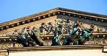 According to Antonio Corazzi's 1825 plans, the Grand Theatre's front façade was meant to feature a triumphal sculpture of Apollo, patron of the arts, driving a chariot drawn by four horses. However, the defeat of the November Uprising caused the idea to be abandoned. The platform above the main entrance meant for the quadriga remained empty for nearly 200 years.