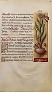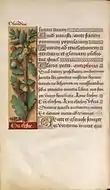 The book is also remarkable for its realistic representations of 337 plants in the borders that most text pages are given.[9] There are flowers, cultivated and wild, shrubs, some trees and among the plants a wide variety of insects and small animals of the countryside. The plants include Cannabis sativa on f. 90v, and the major cereal crops of the day on ff. 94–96. The insects represented are butterflies and moths, dragonflies, grasshoppers, caterpillars, beetles, flies, carpenter bees, crickets, earwigs, bees and beetles. The small animals represented are snakes, lizards, slow worms, frogs, turtles, squirrels, snails, rabbits, monkeys and spiders. The style borrows from the elaborate and realistic borders of natural life developed in the preceding decades by Flemish illuminators, but unlike them Bourdichon generally treats only one species on a page, and often shows roots and bulbs, and labels each page with the plant's name in Latin and French, in the manner of a florilegium or a herbal (a book on medicinal plants).[10] In most pages the border is a single panel to the outside of the text, but in others it surrounds the text on all four sides. The plants are shown as if laid out on a plain coloured surface, upon which they cast a shadow. In 1894 Giulio Camus wrote an account of the plants in the work, and a full modern facsimile was published in 2008. There are 395 images from the book available online through the BnF.[note 3]
