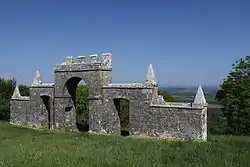 The folly, which was built by a former owner of Creech Grange, Denis Bond, in 1746, is built in the form of a triple arch of ashlar stone. The central archway is surmounted by battlements and flanked by stone walls with smaller doorway arches.[1][2]