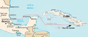 Shortly after midnight on November 25, 1956, in the Mexican port of Tuxpan, Veracruz, Granma was surreptitiously boarded by 82 members of the 26th of July movement including their leader, Fidel Castro, his brother, Raúl Castro, Che Guevara, and Camilo Cienfuegos. The group—who later came to be known collectively as los expedicionarios del yate Granma (the Granma yacht expeditioners)—then set out from Tuxpan at 2 a.m.[8] After a series of vicissitudes and misadventures, including diminishing supplies, sea-sickness, and the near-foundering of their heavily laden and leaking craft, they disembarked on December 2 on the Playa Las Coloradas, municipality of Niquero, in modern Granma Province (after the vessel), formerly part of the larger Oriente Province. Granma was piloted by Norberto Collado Abreu, a World War II Cuban Navy veteran and ally of Castro.[9] The location was chosen to emulate the voyage of national hero José Martí, who had landed in the same region 61 years earlier during the wars of independence from Spanish colonial rule.