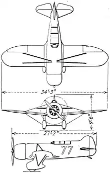 - Drawings were completed on 5 January 1934 of what would be an unbuilt precursor to the R-6, with a 850 hp (630 kW) Pratt & Whitney Hornet air-cooled radial engine.[16] The R-5 differed primarily in being fitted with only a single seat, and drawings of the R-5 are frequently misidentified as that of the R-6. Span was 3 in (76 mm) smaller, while the length was 56 in (1,400 mm) shorter, most noticeably around the firewall. Like the R-6, the R-5 was to have been fitted with flaps, while access to the cockpit would have been through a large door on the fuselage side as on previous racers, rather than through the canopy.