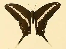 The hindwing is tailed as in Graphium policenes an it also agrees in the other distinguishing marks so nearly with policenes that it can scarcely be distinguished from it except by the unicolorous black middle cell of the forewing and the absence of the submarginal spots of the same wing. The markings of the upper surface consist only of a narrow median band, which, however, is continuous from the costal margin of the forewing to the middle of the inner margin of the hindwiug and composed of 8 to 9 spots on the forewing (in cellules 1 a to 6 or 7 and 8) and 4 spots on the hindwing (in cellules 1 c, 6, 7 and the middle cell), and of 4 to 6 submarginal spots on the hindwing. The hindwing above without red spots. The ornamental band of the hindwing beneath is well developed and consists of red, black-bordered bars in cellules 1 c, 2, 3, 7 and in the apex of the middle cell.[4]