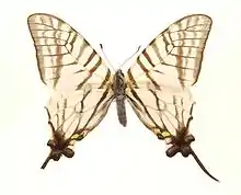 Upperside dead white or very pale cream colour. Forewing: cell partially, and interspaces between the dusky black outer discal markings more or less semitransparent; cell crossed by five black bands, the basal two of which extend to the dorsal margin, the subapical to a little below the modim vein; a black band along the discocellulars, joined at costal margin and above lower apex of cell to the band traversing the cell near its apex; a broad transverse postdiscal black band from near tornal angle to costa; this band double above vein 5, forms three well-marked loops; subterminal and terminal narrower transverse black bands, the former joined onto the postdiscal band near tornal angle; lastly, the postdiscal band outwardly and the terminal band inwardly, broadly and diffusely bordered with dusky black. Hindwing: a narrow black line from base along the dorsum, a broader black line along vein 1, joined below the cell by a broad black band that crosses the latter subbasally, a black patch on the produced posterior portion of the wing, studded at the tornal angle with two conspicuous yellow spots, below which there is a triangular white dorsal mark; the black patch with three somewhat obscure blue subterminal lunules; the tail narrowly edged with white; a narrow black medial line from costa that crosses near apex of cell and terminates on the median nervure; at the upper and lower ends of this are loops formed of slender black lines, in the female well marked, in the male seen only by transparency from the underside; finally, discal, postdiscal and subterrminal slender black transverse lines from the costa terminate in the black anal patch. Underside similar, with similar but much more heavily defined black markings, the upper or costal loop on the short medial transverse black line tinged with yellow; the whole of the median vein and the discocellulars broadly defined in black. Antennae black; head, thorax and abdomen black, with some white pubescence, the head anteriorly tufted with black; head, thorax and abdomen beneath whitish yellow.[1]