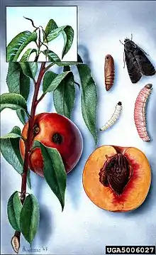 The larvae feed on peach, apple, quince, pear, plum, cherry, apricot and nectarine. They are pinkish to creamy-white with brown heads and about 13 mm long. Early in the season, larvae tunnel in tender twigs causing twig die-back. Heavy infestations may give the tree a bushy appearance. Later generations may feed on terminal growth and developing peaches. Larvae attacking the fruit often enter near or through the stem and bore directly into the interior of the fruit. Larger peaches may show no external damage. Fruit damage may cause an increase in the amount of brown rot.