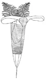 A mature zooid has three important regions, the preoral disc or cephalic shield, the collar and the trunk. In the collar, the mouth and anus (U-shaped digestive system) and arms are found; Graptholitina has a single pair of arms with several paired tentacles. As a nervous system, graptolites have a simple layer of fibers between the epidermis and the basal lamina, also have a collar ganglion that gives rise to several nerve branches, similar to the neural tube of chordates.[9] All this information was inferred by the extant Rhabdopleura, however, it is very likely that fossil zooids had the same morphology. An important feature in the tubarium is the fusellum, which looks like lines of growth along the tube observed as semicircular rings in a zig-zag pattern.