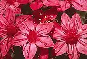 Flowers appear from May to July. At the top of a 10 cm inflorescence, the flowers are over 2.5 cm, deep pink to red. The individual flowers are 5-petalled, star-shaped and have dark pink stamens and white anthers.