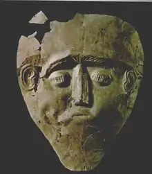 A death mask of electrum has been also unearthed. However, it wasn't found on the face of the deceased male, but in a wooden box next to him.[12] On the other hand, the burial costumes differed from those of Grave Circle A. The latter included death masks of different artistic style and made of gold, like the Mask of Agamemnon.[11]