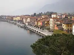 Gravedona ... is situated at the mouth of a gorge. The handsome Palazzo del Pero with four towers, at the upper end, was built in 1586 by Pellegrino Tibaldi for the Milanese Cardinal Tolomeo Gallio. Adjoining the venerable church of San Vincenzo rises the 12th century Romanesque Baptistery of Santa Maria del Tiglio, with campanile, containing two Christian inscriptions of the 5th century.[5]