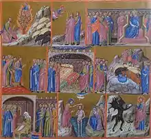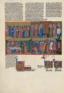 The pages from 185 on are "characterised by [a] great iconographic freedom", consisting of 46 relatively large miniatures with vividly coloured borders which are divided into compartments.[5] They are the work of painter Ferrer Bassa.[6] The unfinished manuscript was transferred to Catalonia shortly after being made.