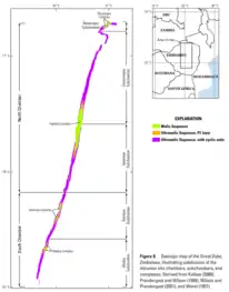 The well-layered lower units of ultramafic rocks comprising the Great Dyke are locally overlain by erosional remnants of gabbroic rock. These mark the centres of the four sub-chambers within the Great Dyke magma system, namely (from north to south) Musengezi, Darwendale, Sebakwe and Wedza. Each of these sub-chambers has an elongate, doubly plunging synclinal structure, and was fed by a feeder dyke continuous below almost the entire Great Dyke.[3] Stratigraphically each sub-chamber is divided into a lower Ultramafic Sequence of dunites, harzburgites, olivine bronzitites and pyroxenites together with narrow layers of chromitite that constitute the bases of cyclic units and that are extensively mined along the Great Dyke, and an upper Mafic Sequence mainly consisting of a variety of plagioclase-rich rocks, such as norites, gabbronorites and olivine gabbros.[4]