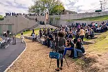 The Falls are viewable from Haines Overlook Park on the south and Mary Ellen Kramer Park on the north. Drive-by viewing is available from McBride Avenue where it crosses the river just above the Falls. A footbridge over the Falls gorge (historically, the eighth such bridge to span this chasm) also serves as an outlook point. A visitor's center at the corner of Spruce and McBride avenues, in the Great Falls Historic District, provides a historical overview of the falls and the industrial and cultural history of Paterson. A record 177,000 visitors went to the Great Falls in 2016.[12]