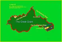 The map by Nikater frequently depicted on the internet correctly indicates the land contained between the rivers as the Great Grant. That map, however, fails to include a very large boundary that lies to the south and that permits passage into the land bounded by the rivers via the all-important Cumberland Gap. The land in question within the Great Grant has a common boundary with the lands described in the Path Grant Deed that lies along the crest of Powell's Mountain.[56]