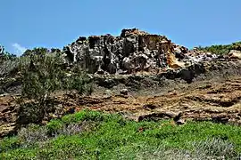 A unique feature of Great Sandy National Park is the coloured sands, which are formed by old sand mixed with clay into a consolidated mass. The visible hues include red, brown, and yellow, which are a reflection of the iron-rich minerals embedded in the sands for thousands of years and brought to the surface by wind and water eroding the land.[8]