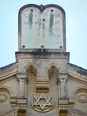 While the first synagogue was built in the Neoclassical style, the current one combines Romanesque and Byzantine Revival. While there are some elements of Oriental styles, it is not built in the Moorish Revival style that was popular for other synagogues at the time. There are two towers on the facade, similar to bell towers on church facades; some contemporary Jews criticised the design for looking too like a church, and refused to give over funding for the towers to be topped with bulbs. At the top of the facade there is a sculpture of the Tablets of Stone bearing the Ten Commandments.[3]