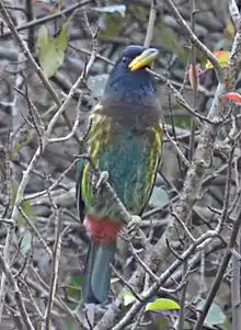 The great barbet (Psilopogon virens) is an Asian barbet native to the Indian sub-continent and Southeast Asia, where it inhabits foremost forests up to 3,000 m (9,800 ft) altitude. It has been listed as Least Concern on the IUCN Red List since 2004 because of its wide distribution.[1]