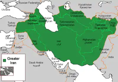 Map showing the geographic, political (partial), and cultural reach of Iran (historically known as Persia) and the Iranian peoples corresponding to the modern-day designated region of Greater Iran in green.[1]