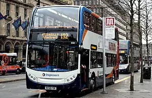 It was numbered 92 on 10 January 1949, when tramway service was withdrawn and the Manchester terminus moved to Piccadilly Gardens.[2] It was owned and operated jointly by Manchester and Stockport Corporations.[3] On 1 November 1969, following the Transport Act 1968,[4] both municipal operations, along with others, merged to form SELNEC. Within a short space of time, the route was renumbered 192.[4][5] Over the next 17 years, the operator's title changed from SELNEC, to Greater Manchester Transport and then Greater Manchester Buses.