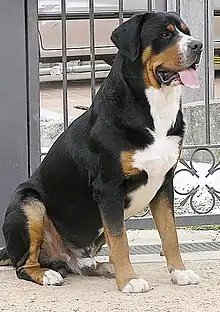 The Greater Swiss Mountain Dog (German: Grosser Schweizer Sennenhund or French: Grand Bouvier Suisse) is a dog breed which was developed in the Swiss Alps. The name Sennenhund refers to people called Senn or Senner, dairymen and herders in the Swiss Alps. Greater Swiss Mountain Dogs are almost certainly the result of indigenous dogs mating with large mastiff-type dogs brought to Switzerland by foreign settlers. At one time, the breed was believed to have been among the most popular in Switzerland.[1] It was assumed to have almost died out by the late 19th century, since its work was being done by other breeds or machines, but was rediscovered in the early 1900s.[2]