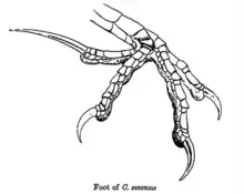 The young when hatched have black skin and white hairy feathers (termed as trichoptiles) forming a fringe over the eye and beak.[7][8] The centre of the belly is pinkish and the upper mandible is black with a pink edge. The iris is brown, gape yellow and feet dark brown-gray.[6] The juvenile of race parroti is unmarked dull black on the underside (contra barred in the northern races) and much darker, dusky chestnut on the wings. Race bubutus found in Southeast Asia has a distinct call. Individuals from the Western Ghats are very similar in size to the lesser coucal Centropus bengalensis but the latter has a stubbier bill, shorter tail, wing tips extending beyond the tertials and a chestnut wing lining, dark eyes and a tail with green/bronze sheen.[3] Females of the race parroti develop dusky or sooty wing coverts between November and January and the northern boundary of the race is along the Punjab plains where it forms intermediates with the northern forms.[9]