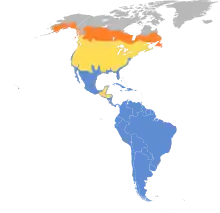 They migrate to the Atlantic and Pacific coasts of the United States, the Caribbean, and south to South America. They are very rare vagrants to western Europe.