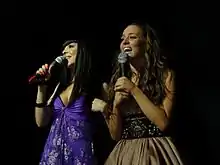 The stage show included new choreography, as well as Victoria Halkiti and Nektarios Georgiadis as backing vocalists.[38] Kalomira started off the show sitting on a diamond sequenced bench held up by her dancers.[39] She then got down and started a dance routine with complex choreography. There was also a large purple book on stage that opened up as a heart shaped pop-up book that Kalomira stepped out of when she sang the lyrics "an open book".[40] In time with the book opening, Kalomira removed her pink dress revealing a pink and silver mini-dress underneath. Toward the middle of the song during the break, the cameras cut to Kalomira who was doing a provocative dance; shaking her whole body.[39] At the end of the song, she was slightly lifted up by her dancers. The background image on stage was a skyline of buildings that moved with glowing lights. She wore clothes exclusively by JLO[41] and managed to finish in first place out of nineteen countries, receiving 156 points.[42]